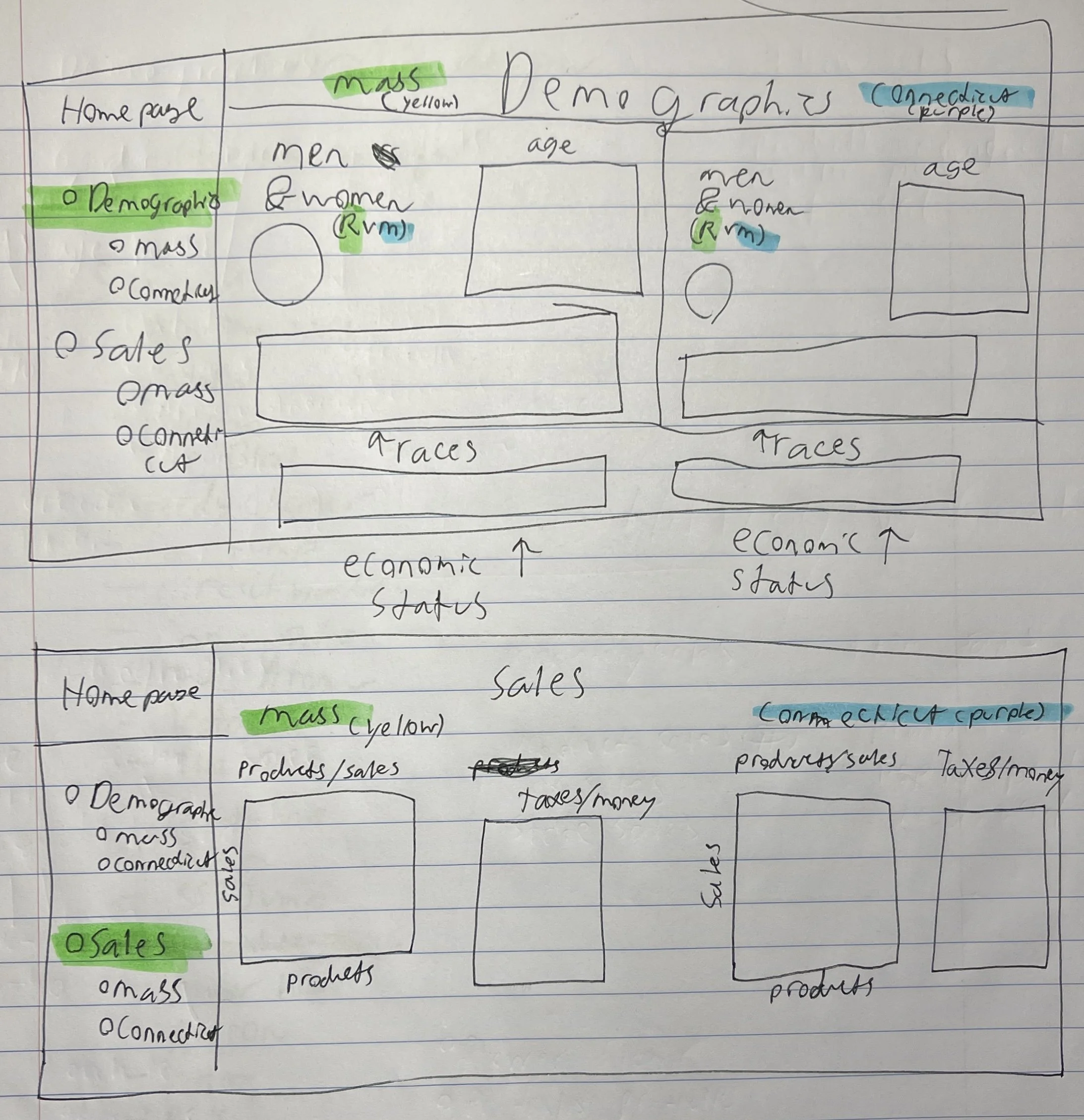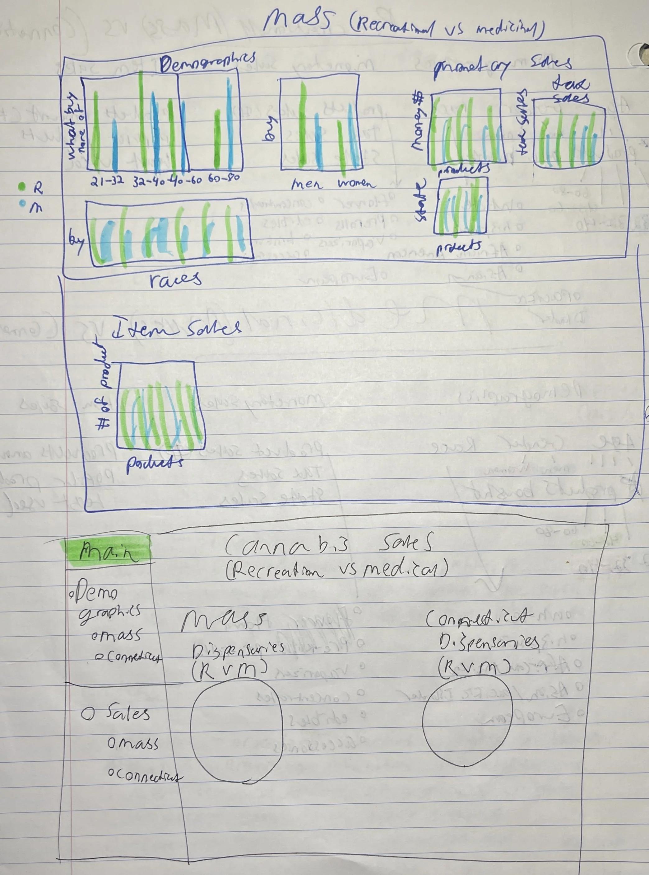 In the finalized sketches, the dashboard becomes more cohesive and user-friendly. The demographics page is clearly divided with design lines to separate data by state, making comparisons easier to interpret. For the sales pages, I narrowed the focus to two key charts per state—highlighting raw product sales and tax revenue generated from recreational cannabis. These visualizations were chosen to clearly communicate the financial and economic impact of legalization across regions.