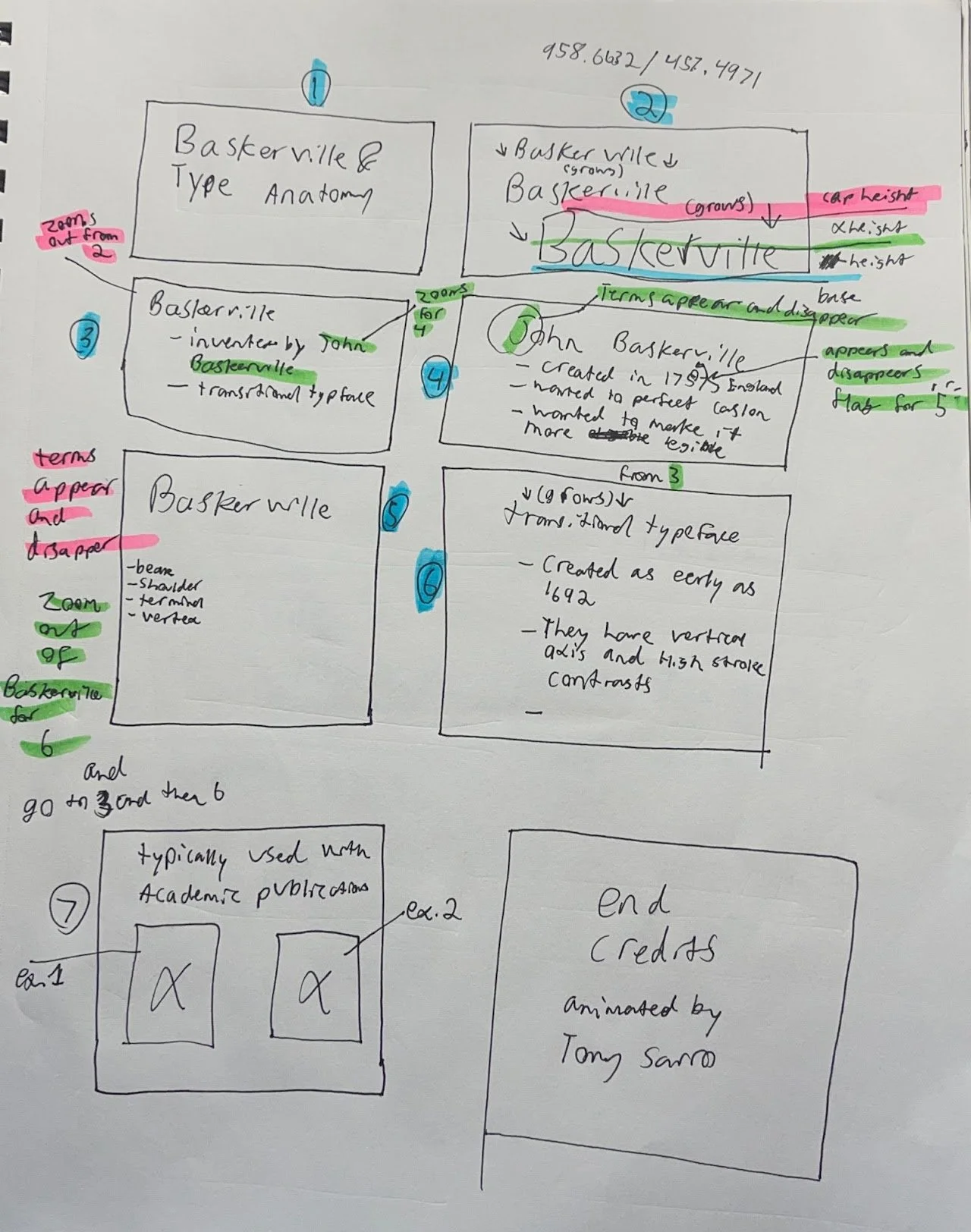 After my initial sketches were complete, I scanned them into Adobe Photoshop and organized each slide into its own file. This made it easier to manage and organize the slides when importing them into After Effects. After the files were imported, I began designing the layout and animating the text. I added motion by having the text enter dynamically and then move, reshape, and resize across the slides to emphasize key elements of type anatomy. To tie everything together, I selected a background color inspired by the era in which Baskerville was originally created, aiming to reflect the typeface’s historical roots while maintaining a cohesive and visually appealing aesthetic.